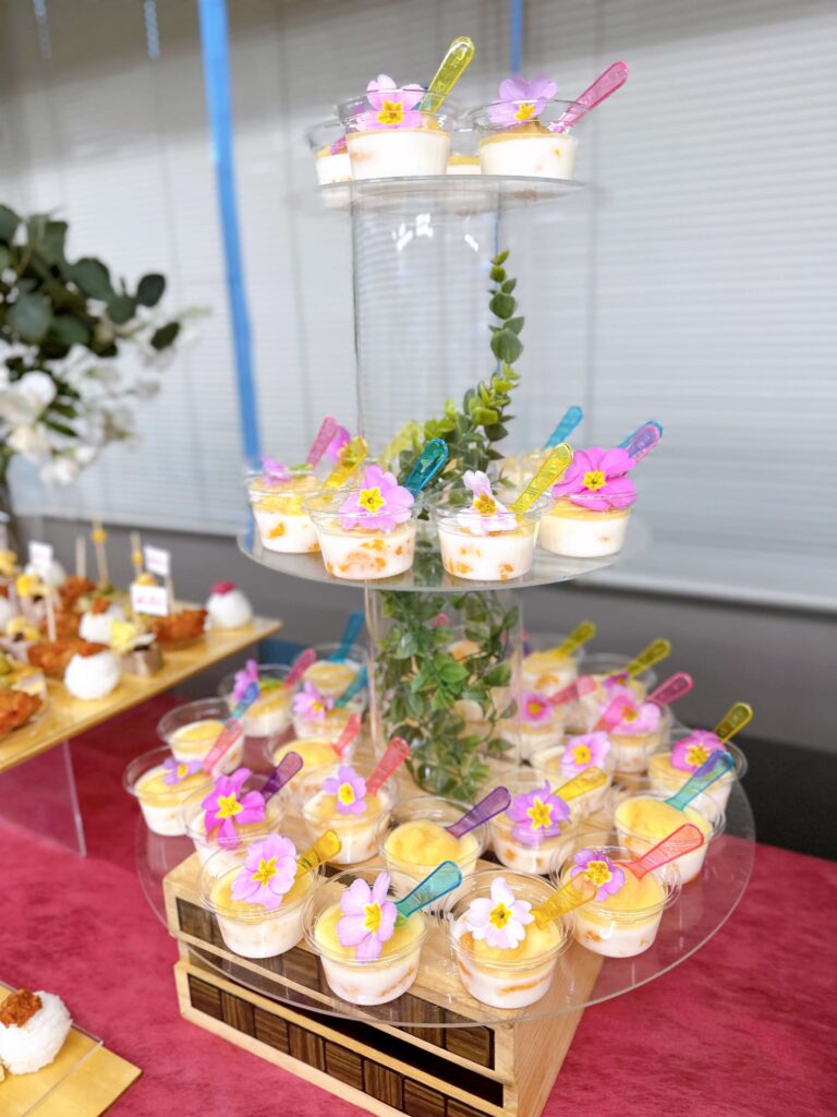 なるべく箸を使わずとも手に取るだけで食べられるものを中心にご用意しております。デザートについてはスプーンも一緒に飾ることで、別で手に取る手間を減らしています◉